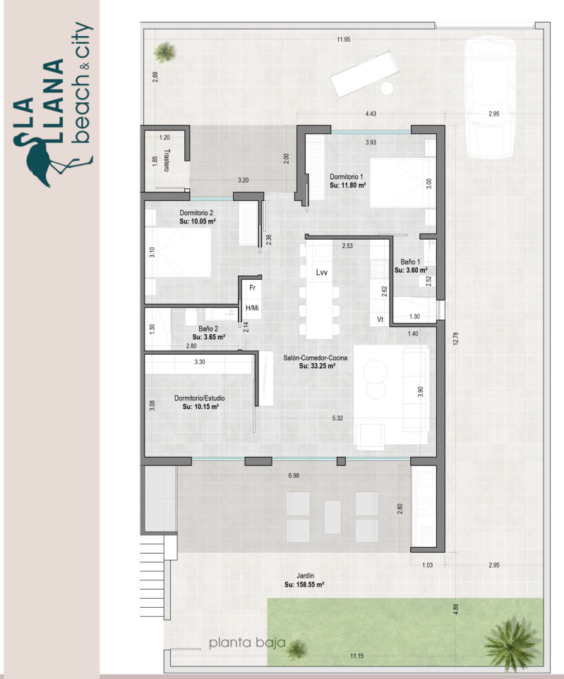 Voorkant woning met schuifhek en toegangspoort. Op de achtergrond zijn twee andere fases van La Llana beach & city zichtbaar.