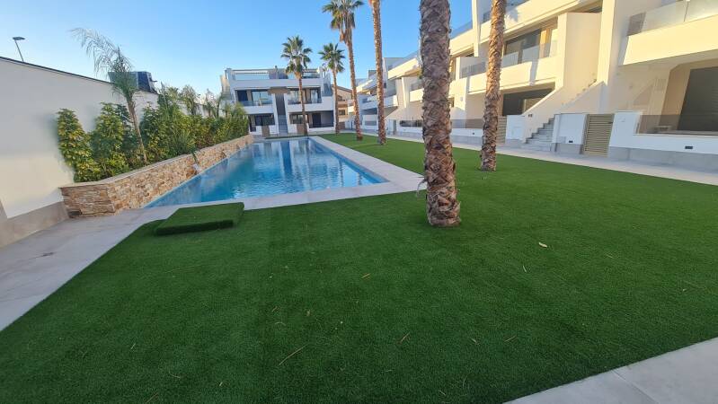 Er is veel aandacht besteed aan de inrichting van de buitenruimte. De plantenbakken langs het zwembad met ingebouwde watervallen zorgen voor een natuurlijke uitstraling. Het groen rondom het zwembad is kunstgras. Het zwembad (ongeveer 12 meter lang) heeft een ondiep gedeelte waarin je heerlijk kunt luieren.